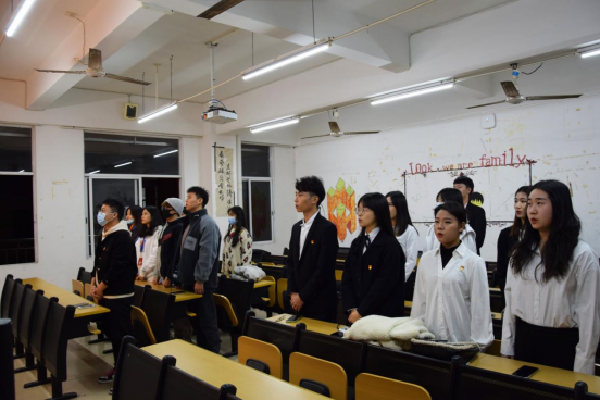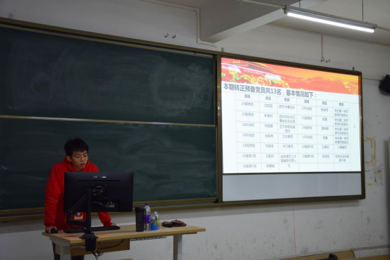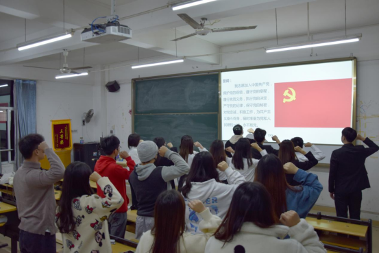 会议开始,全体起立面向国旗奏唱国歌。接下来由主持人汤尧天同学宣布本期预备党员转正人员名单:余银燕、林丽敏、刘耀斌、王韵欣、李春晓、王紫炫、郑诗雨、杨媚、陈俊芳、赵晋、沈莉圆、顾梓辉、彭紫欣及介绍本期转正预备党员的基本情况。随后13名预备党员依次从个人情况、思想、学习、生活、工作、存在的不足及努力的方向、自我鉴定及转正申请七个方面汇报了自己在预备期的表现。在场正式党员对其情况进行提问,预备党员们依次回答问题。经党员投票表决、支部讨论通过,同意余银燕、林丽敏、刘耀斌、王韵欣、李春晓、王紫炫、郑诗雨、杨媚、陈俊芳、赵晋、沈莉圆、顾梓辉、彭紫欣13名同志按期转为中共正式党员,并由学生党支部书记张远老师带领党员庄严宣誓。