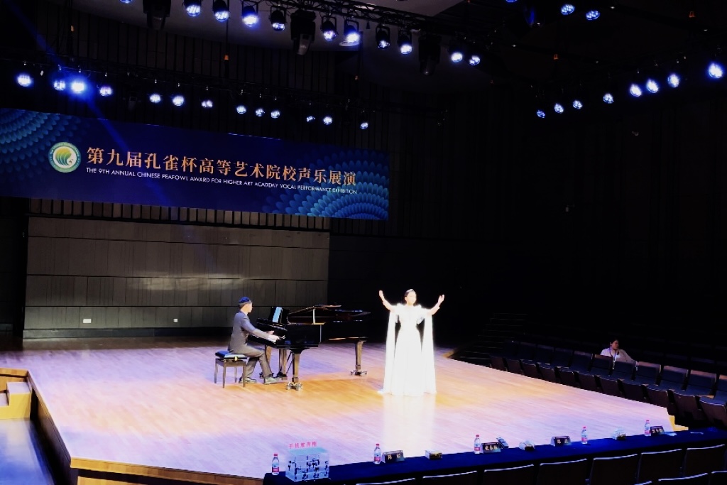 (关俊文)第九届孔雀杯高等艺术院校声乐展演及系列活动于7月28日在浙江音乐学院拉开帷幕。来自全国200多所校(院)共2000多名师生参加了为期7天的展演。孔雀杯高等艺术院校声乐展演及高校声乐学术交流活动,是高等艺术院校声乐大规模、高层次的交流和展演活动。此项大赛由中国声乐家协会、孔雀杯展演组委会主办。大赛设教师、研究生、学生组,专业分别设民族、美声组、流行组,并邀请全国50多位音乐学院院长、系主任、声乐教授、歌唱家、理论家担任专家评审。我院青年教师和学生代表学校角逐流行音乐院校教师组、综合师范院校本科生民族组、钢琴艺术指导民族组比赛。其中赵南颖老师获得流行音乐院校教师与研究生布鲁斯和爵士乐组“金孔雀杯”奖,并作为优秀选手在崔泉馨教授讲座上进行范唱,在其他组别的比赛中,我院学生林信校荣获综合师范院校本科生民族组“展演奖”、梁俊灵荣获钢琴艺术指导民族组“优秀钢琴伴奏奖”。