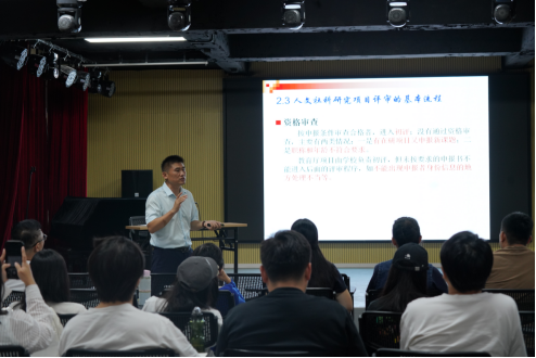 本次讲座主要从人文社科类项目申报前的准备、申报书填报以及他成功立项的教育部人文社科项目的实际案例为大家进行了分享。