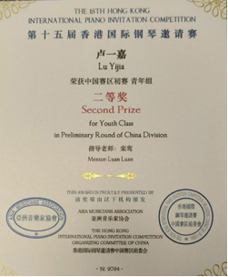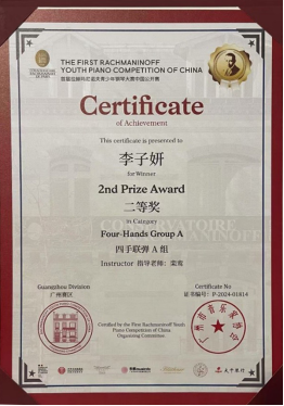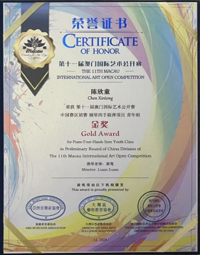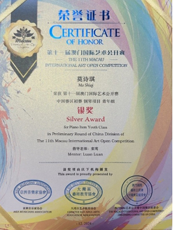 (栾鸾)近日,从第十一届澳门国际艺术公开赛赛场传来喜讯,suncitygroup太阳新城22音表9班(Z)的陈欣童同学凭借其卓越的艺术才华和精湛的技艺,在众多参赛选手中脱颖而出,一举斩获金奖,莫诗琪同学斩获二等奖;由广州市音乐家协会举办的首届拉赫玛尼诺夫青少年钢琴大赛中国公开赛中,来自22音表1班的李子妍同学获得二等奖;在第十五届香港国际钢琴邀请赛中,22音表8班(Z)的卢一嘉同学、22音表5班(Z)的杨思晴同学表现出色,荣获二等奖。