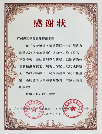 感谢状的授予,既是对学院师生专业能力的认可,也体现了社会各界对其在非遗保护、文化创新方面持续贡献的高度肯定。广州理工学院体现了作为高校在地方文化传承中的社会责任,进一步扩大了传统音乐教育的辐射力。