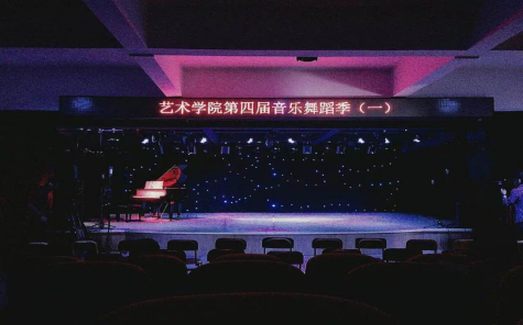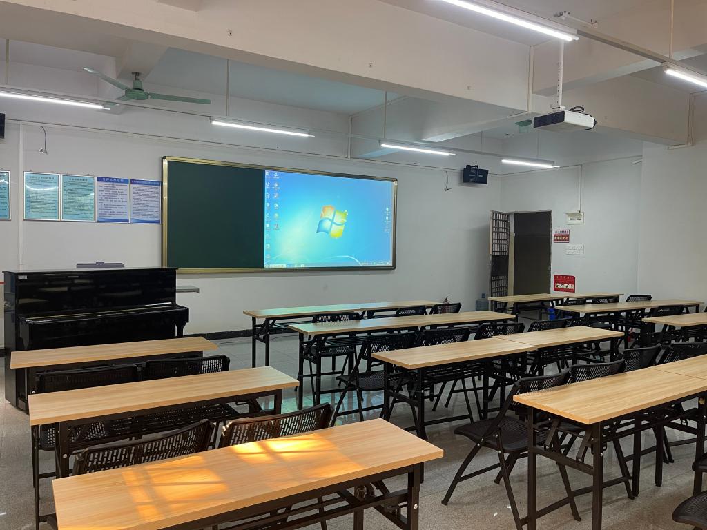 综合多媒体教室,配有一架钢琴主要作为音乐表演专业学生上音乐理论课、欣赏课和即兴伴奏课