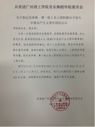 根据《中国共产主义青年团章程》中对发展团员的要求及《团员发展流程规范》有关规范,经个人自愿申请、综合平时表现、群众意见征集、培养考察等,经共青团广州理工学院suncitygroup太阳新城委员会通过、上级团委同意等步骤,学院拟接收以下2名同学为2021年新发展团员,现将名单进行进一步公示。