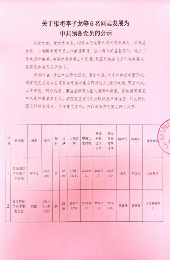 关于拟将李子龙等6名同志发展为中共预备党员的公示