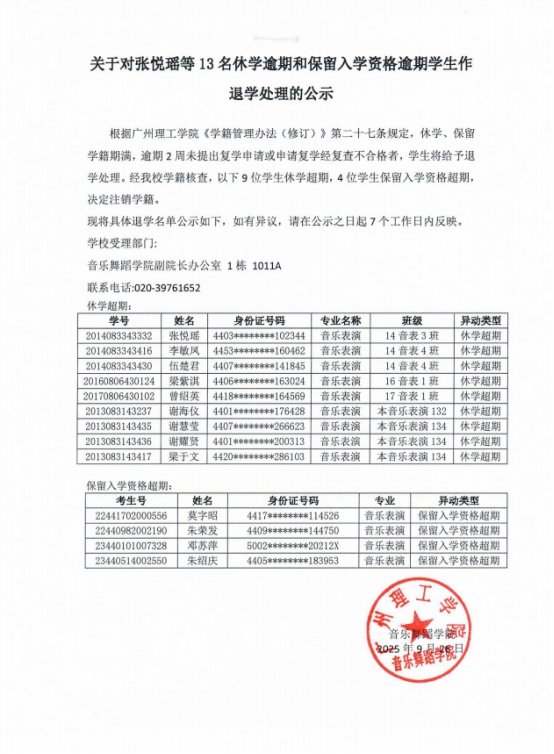 关于对张悦瑶等13名休学逾期和保留入学资格逾期学生作退学处理的公示