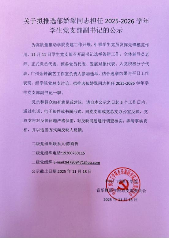 关于拟推选郁娇翠同志担任2025-2026学年学生党支部副书记的公示