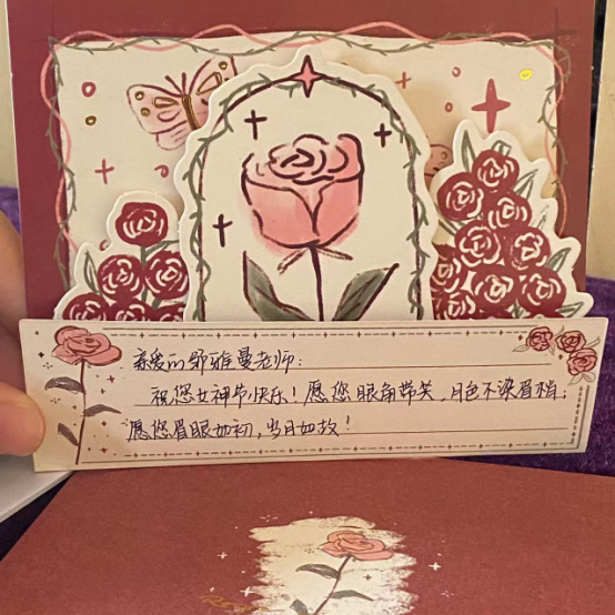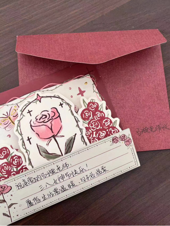 此次活动学院高度重视,精心组织。为营造出健康、和谐、积极的节日气氛,进一步提升女职工爱岗敬业的工作热情,聚集学院发展正能量,3月8日早上,老师们像往常一样在各自的工作岗位上认真忙碌着,学生们向女教师们送上贺卡与鲜花,表达了最真挚的祝福。温暖的祝福和贴心的礼物,给我院女教师们带来了节日的惊喜和欢乐。全艳老师表示:“在3.8妇女节收到了学生们的鲜花和贺卡,那一刻她感受到的是最真诚的祝福,我觉得那是老师最幸福的时刻!”一束鲜花、一个小心意和一句祝福,既让女教师们感受到了学校的温度和感情,也传递着学校文化精神中满满的人文情怀。