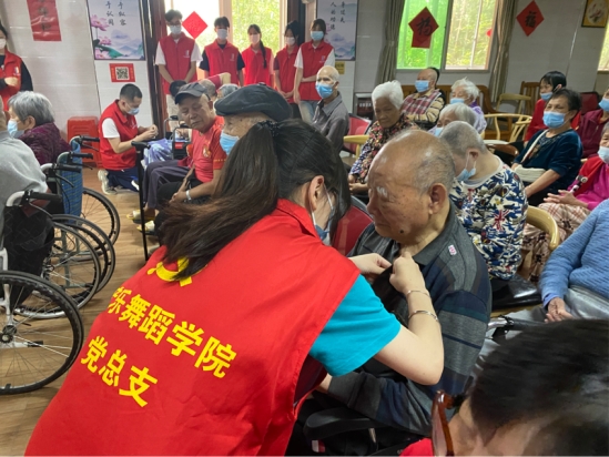 在养老院工作人员的带领下,党员志愿者团队参观了养老院的居住环境,了解老人们的日常生活。随后,党员志愿者们来到表演室,在精心布置场地之后,迎接老人们到活动现场,并为现场的革命老党员佩戴党员徽章。