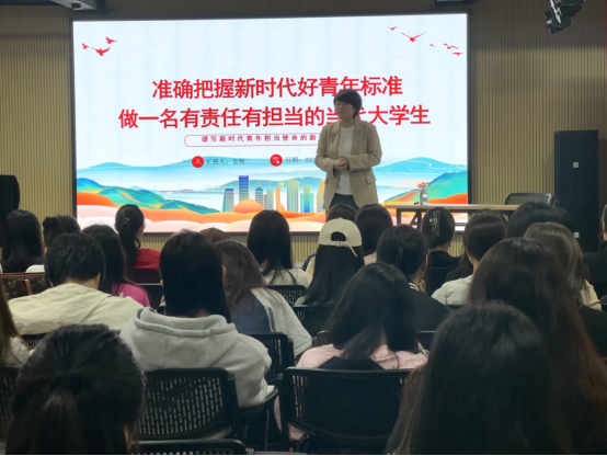 全艳副书记通过“准确把握新时代好青年标准”来展开讲述当代大学生的责任与担当,引导同学们思考个人职业规划和人生发展方向。全书记列举优秀毕业生的学习与就业生涯,希望同学们从中收获新思路,学会规划人生,在自我学习中感受责任与担当,树立正确的价值观,为实现理想努力拼搏。