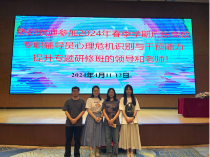(潘栩涵)为贯彻落实《教育部办公厅关于加强学生心理健康管理工作的通知》,为一线学生管理工作队伍加强学生心理疏导和心理危机干预提供技术支撑,广东省高等学校心理健康教育与咨询专业委员会于4月11、12日举办2024年春季学期广东高校专职辅导员心理危机识别与干预能力提升专题研修班线下培训。suncitygroup太阳新城学工组长刘国杰、心理工作站负责人潘栩涵、辅导员黄婧、葛润琪参加本次培训。