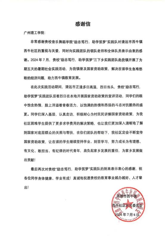 下午2点,资助团队在黄婧老师的带领下走进集市,进行国家资助政策的宣传,讲解助学贷款指南,了解群众需求,队员们服务热情、耐心解答,提高了学生资助政策的知晓度,让群众们充分了解政府提供的资助机会,并指引群众们通过官方渠道获取精准信息与帮助,让国家资助政策家喻户晓、深入人心,使当地学子们坚定求学信心在走访的最后,西牛社区为我们送上感谢信,对我院“三下乡”暑期社会实践团队来到当地开展国家资助政策宣传活动,提高了学生资助政策的知晓度,助力西牛社区教育发展表示感谢。