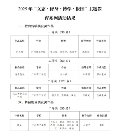 近日,2025年“立志·修身·博学·报国”主题教育系列活动获奖结果揭晓,广州理工学院suncitygroup太阳新城学子在歌曲传唱类、舞台剧目类比赛中表现亮眼,一举拿下多个奖项。