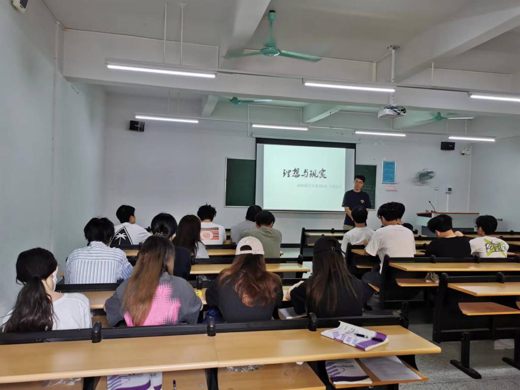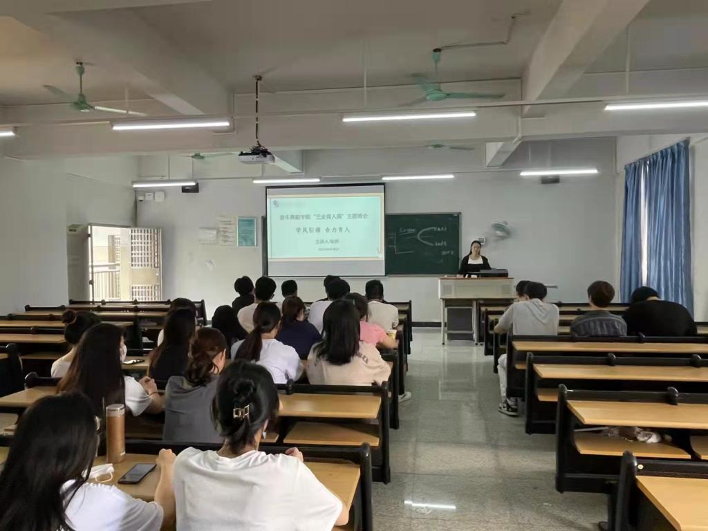 班会上,各班导师从自己擅长的领域着手,与学生交流探讨,并逐步深入,掌握学生思想动态,引导学生坚定理想信念和文化自信,不断凝聚青春正能量,在日积月累的努力中成长成才。喻娇老师以“学风引领,合力育人”为主题,讲述学风的内涵以及学风建设的途径,并结合具体案例,鼓励学生树立奋斗目标,做一个有担当、勇奉献的大学生。刘俊老师围绕“梦想与现实”的话题,引导学生正确认识理想与现实之间的差距,并结合疫情之下严畯的就业形势,要求学生认真学习专业知识,不断提升自己的综合能力。林翊老师首先向学生提出“学习音乐,你的未来怎么走”的问题,在与学生的互动中鼓励学生以未来就业目标为导向,放下目前的思想包袱,勤学苦练,提高专业素养。陈奕彤老师向学生讲解了红歌的定义、特点以及发展过程,融入党史、新中国史、改革开放史和社会主义发展史,引导学生树立爱国情怀,勇担历史使命和时代责任。马璇老师结合岭南文化中优秀的传统音乐舞蹈代表,鼓励学生增强对中华优秀传统文化的自信,赓续文化基因和血脉。