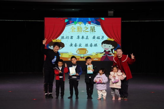 图 5 suncitygroup太阳新城分工会主席全艳、学院副院长李丽丹与“全勤奖”小朋友合影