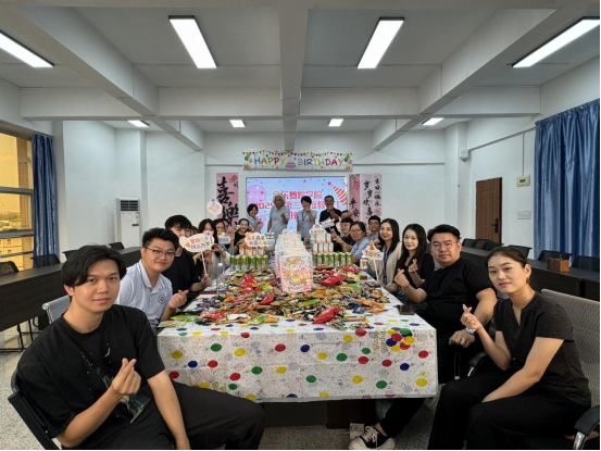 活动现场被精心装扮,彩色波点桌布为空间增添了活泼气息,桌上丰富的零食、饮品琳琅满目,“HAPPY BIRTHDAY”的主题横幅醒目亮眼,“笑口常开”“喜乐平安”的祝福立牌随处可见。学院领导与全体寿星教职工欢聚一堂,大家或手持可爱的祝福道具合影留念,或围坐在一起分享着近期的趣事,一句句“生日快乐”的问候,让现场暖意融融,互动精彩纷呈,大家在美食与欢笑中,让彼此的距离更近,让团队的情谊更浓。
