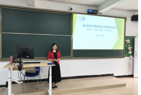 乐洋艺术培训中心成立于2010年,拥有稳定的教师团队和完善的教学体系,学校秉承着先成人,再成才,教为辅,育为主的价值观。招聘宣讲会现场,乐洋艺术培训中心的创始人黄浏妹校长介绍了企业的发展历程、发展理念和主要课程,使同学们初步了解了企业概况,同时,黄校长详细介绍了企业的招聘岗位及职责要求,分享了自己的教学经验与工作心得。会后,多名学生积极与黄校长进行了沟通,就岗位要求、课程设置、个人发展等多个方面进行了探讨交流,学生表示获益良多。