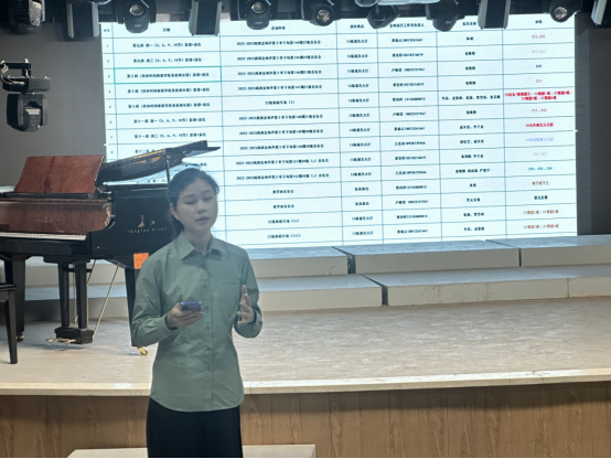 研讨会上,综合实践音乐会总负责人梁雯婷给老师们展示了本学期从第十周开始的音乐会顺序,每场音乐会相应的负责人同学及联系方式,以及向老师们讲解了关于音乐会彩排的事宜。金钟演艺工作室的同学们将对舞台的道具、流程进行一次彩排演练。各场音乐会如要增加彩排次数需要提前两周进行预约。工作室成员将对每场音乐会进行曲目信息的收集,以及提供相应的主持服务,如果音乐会有用到非主持组的同学进行主持,需要提前跟工作室进行报备。
