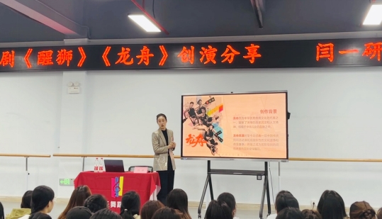 本次讲座闫老师主要从舞剧《醒·狮》《龙舟》中非遗创新亮点,详细地介绍了两部舞剧的创作历程。《醒·狮》以民族觉醒为立意,以传统文化为表达,呈现出独具匠心的艺术气质。舞剧还将南拳中的典型素材加工提炼,创造出“狮舞”的独特舞蹈语汇。并融合了大量南拳、蔡李佛拳、木人桩等动作,刚劲有力,震撼人心。《龙舟》作为中华优秀传统文化的代表之一,凝聚了深厦的历史沉淀和人文精神,根情于中华儿女的血豚之中。龙舟竞渡时至今日已由一项中国传统民间活动演化成国际性的文化盛事和体育寒事,并随之成为国际级别的竞技体育而受到全球服目。如果说《醒·狮》是通过深挖岭南传统文化,以外寇入侵为故事背景,弘扬了民族气节;那么,舞剧《龙·舟》则是通过展示中华文化,以国际龙舟大赛的真实事件为背景,弘扬了时代精神。紧接着,闫老师在讲座中播放了两部舞剧的纪录片,揭秘了两部舞剧幕后的故事。