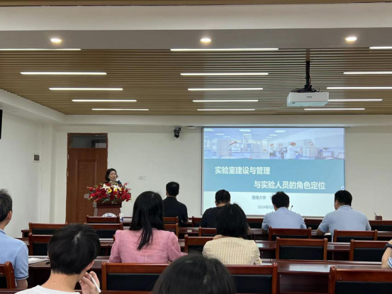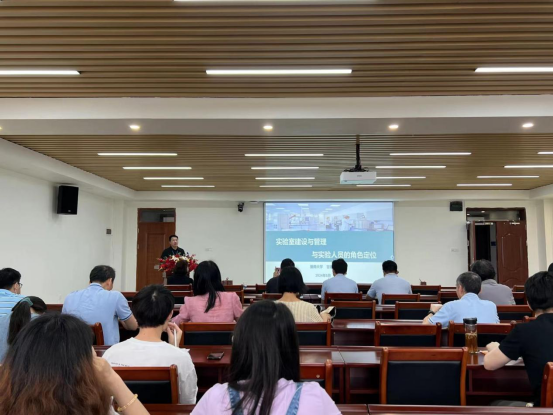 2024年5月9日星期四下午14:30-16:00,暨南大学前实验室与设备管理处处长甘焕英来我校开展实验室管理培训讲座,讲座由我校实验室与设备管理中心副主任高文财主持,甘焕英教授主讲,我校全体实验室管理人员,各二级学院分管实验室领导,实验室与设备管理中心相关人员共计50余人积极参与学习。我院参会人员有副院长刘福瑞,实验员唐雄、王熙。