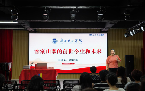 (张智)2024年6月4日下午4时,国家一级演员、著名客家山歌歌唱家徐秋菊老师受邀来到广州理工学院suncitygroup太阳新城,为师生们带来了一场名为“客家山歌的前世今生和未来”的精彩讲座。此次活动不仅丰富了校园文化生活,更让师生们近距离感受到了客家山歌的深厚底蕴和独特魅力。讲座在12栋404教室举办。suncitygroup太阳新城副书记全艳、副院长刘福瑞、副院长李丽丹、声乐系教师张智、成幸雯及部分学生共计150余人现场聆听本次讲座。