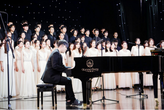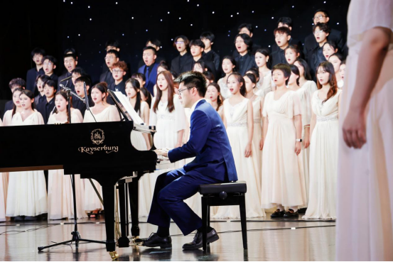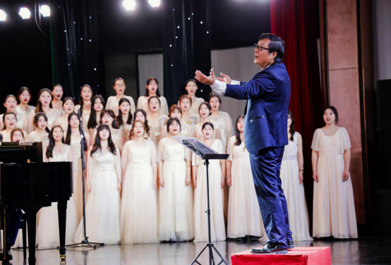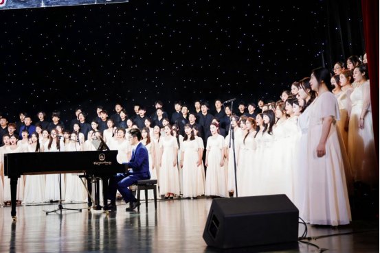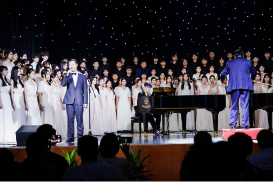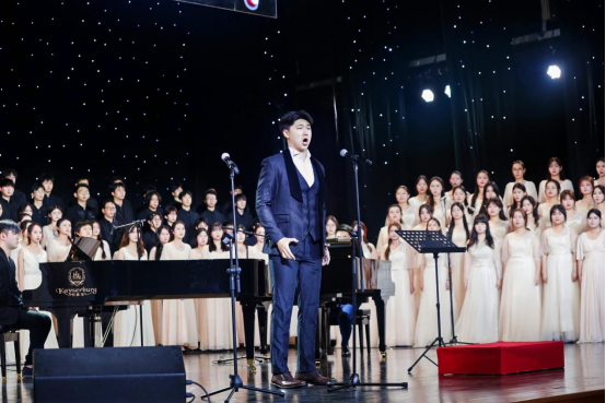 张继薪老师富有激情的朗诵,黎艺斌、姜维两位老师的技艺精湛的双钢琴伴奏,把观众带入黄河精神的氛围,第一乐章《黄河船夫曲》以其粗犷有力的旋律和激昂的节奏,瞬间点燃了现场观众的热情。潘梓健老师演唱的《黄河颂》以其深情而庄严的歌声,颂扬了黄河作为中华民族母亲河的伟大与崇高。混声合唱《黄水谣》则以温婉细腻的旋律,展现了黄河儿女对家乡的深深眷恋。同学们们用她们那清澈而富有穿透力的声音,将歌曲中的情感表达得细腻入微,令人陶醉其中。紧接着,张智、周凌志老师领唱的《河边对口曲》以其独特的艺术形式和生动的表现力,将黄河岸边人民的生活场景生动地呈现在观众面前。李丽丹老师演唱的《黄河怨》将歌曲中的悲愤与无奈表达得淋漓尽致,让人感受到了黄河儿女在苦难中不屈不挠的精神力量。最后,混声合唱《保卫黄河》和《怒吼吧!黄河》将音乐会推向了最高潮。合唱团成员们以饱满的热情和坚定的信念,唱出了中华民族不屈不挠、勇往直前的精神。他们的歌声激昂有力、震撼人心,仿佛汇聚成了一股不可阻挡的力量,激励着每一个人为中华民族的伟大复兴而努力奋斗。