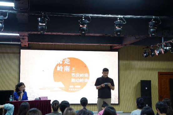 讲座伊始,李教授为大家介绍了民间文化的概念以及民间文艺家协会这个机构在保护及传承中国民间文化中所发挥的功能与作用。作为一名研究广东民间文化的资深学者与专家,李教授结合自身的采风与调研,深入浅出地从“节庆岭南”和“舞动岭南”两个专题为在位的师生进行分享。