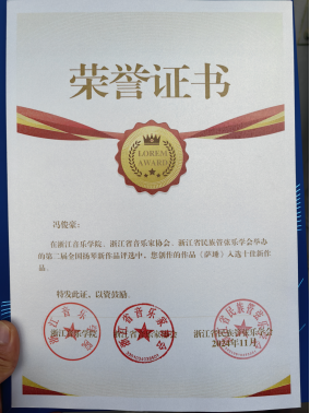 11月15日—11月17日,第二届全国扬琴新作品音乐会及研讨会在浙江音乐学院举行,广州理工学院青年作曲教师冯俊豪创作的扬琴作品《萨埵》,在本次音乐会作品评选中获全国扬琴新作品”十佳作曲奖”。同时,该作品也入选了本次新作品的研讨会。