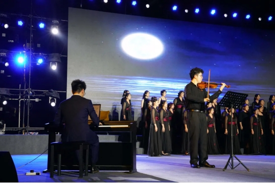 一幅春日之际,人们欢聚一堂,高举花环,节庆游行的欢腾盛景被周小漩、官山月等同学的古筝重奏《柳京之舞》生动描绘。李芸韬、尹婉玲、张凌等同学的群舞《碇步桥》,以古朴雅致的音乐和轻柔绵绵的舞姿,流动出质朴玲珑的江南水乡女子的最美色调与景致。成幸雯、黄雅倩、胡慧洁、覃诗涵四位老师的歌曲《幸福中国一起走》,在亲切温存的歌声中,聆听了新时代亿万人民的心声,感受了新时代阔步前行的步伐。广东歌舞剧院的国家一级演员潘旭老师带来的歌曲《闪亮的翅膀》和《远走高飞》,表达了青年学子对梦想的追逐,对未来的憧憬。朱海明、李子龙的器乐重奏《Mojito》,用轻快自在、热情澎湃的曲调,演绎着青春的礼赞。周钰、李欣、殷美晨等带来的群舞《茉莉花开》,将圆韵律与纸伞相结合,用轻快活泼的节奏搭配婀娜动人的舞姿,展现出了中国古典舞蹈的典雅与韵味。男声独唱周凌志的歌伴舞《把一切献给党》,坚之于心,行之于力,用最真诚、最响亮的歌声、最美妙的舞韵再一次重温、再一次叩问我们的初心使命。女声独唱赵南颖的歌伴舞《不同凡响》动感十足,酷炫的舞台和灵巧的舞姿带给大家一场视觉盛宴,在热烈的氛围中感受着青春的美好。陈师本、黄展、孙莹等同学的舞蹈《我和我的家乡》,用青春洋溢、真挚动人的表演再现了南海大沥现实生活中的人和事,表达了青年一代对家乡变化的关注,对家乡建设的付出,对幸福生活的追求。南方歌舞团青年演唱家国家一级演员王璀璇老师的歌曲《你的答案》,倾情演绎展现了新时代广理学子们意气风发、执着勇敢向前的精神面貌。陈玉瑶、陈宁曦、谢水清等同学的群舞《水色》窈窕秀美,若仙若灵,优雅灵动的舞步尽显青春多彩、青春活力。由陈奕彤指挥、黎艺斌钢琴伴奏、何慈庆小提琴、陈大帆打击乐和广州理工学院合唱团共同带来的合唱《月半小夜曲》、《广府情》,演奏磅礴大气,节奏轻快活泼,旋律青春灵动,点燃了全场氛围。最后在与张智、林翊、谢香平、符梅凤四位老师倾情领唱的《领航》中,共同唱响了本次晚会的尾声,用恢宏激昂的旋律、振奋人心的歌词、波澜壮阔的画面,深情讴歌了中国共产党为中国人民谋幸福、为中华民族谋复兴的初心,全面展现了广州理工师生的蓬勃朝气和律动之美。
