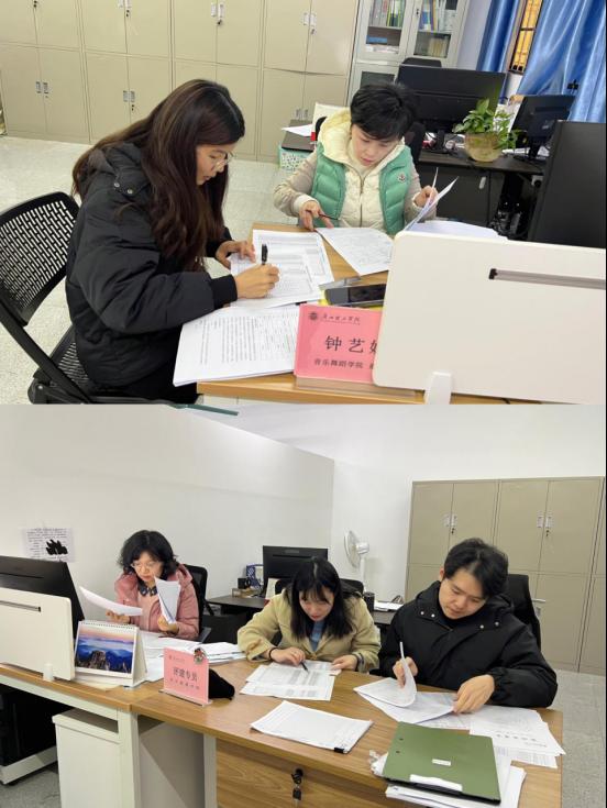 副院长李丽丹、舞蹈系副主任李苗、声乐教研室主任梁泰迅、实践教研室主任成幸雯、评估专员张颖在检查教学资料