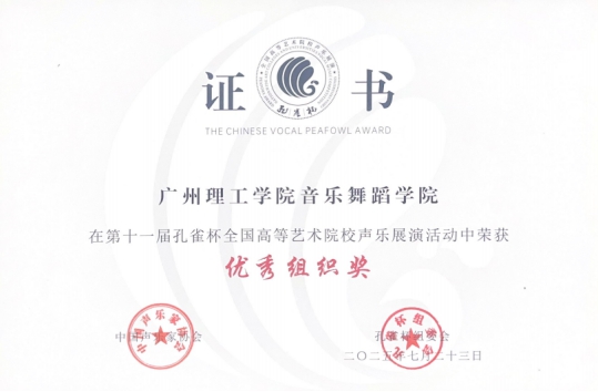 (黎艺斌)7月16日至7月23日,2025第十一届孔雀杯高等艺术院校声乐展演暨第九届高校声乐学术交流活动在星海音乐学院举行,孔雀杯高等艺术院校声乐展演及系列活动是由中国声乐家协会与四十多所高等艺术院校联合发起举办的大规模、高层次的声乐展演及学术交流活动,至今举办十一届,在全国高校广大师生中产生了积极而深远的影响。广州理工学院suncitygroup太阳新城师生代表共16人参加此次展演活动,黎艺斌老师作为领队教师及钢琴艺术指导,其中青年教师周凌志、潘梓健分别荣获综合师范院校教师美声组“银孔雀杯”和“铜孔雀杯”奖,李绍威老师荣获展演奖;学生陈欣欣和李芷婉荣获综合师范院校本科生优秀奖,学生阮靖茵、杨贝贝、邓洪辉、郭子涵、陈彦伊、邓丽倪、彭嘉、吴心怡、陈卓轩、黄兆富等荣获综合师范院校本科组的展演奖,涵盖了美声唱法、民族唱法、摇滚与嘻哈说唱等。广州理工学院suncitygroup太阳新城再次荣获优秀组织奖。